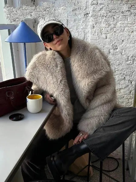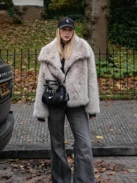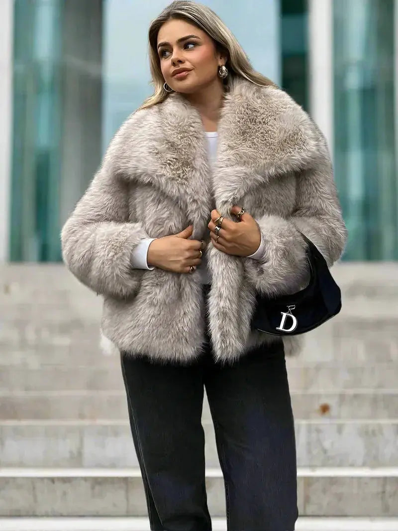 Chame a atenção com o elegante casaco curto e fofo de pele sintética com lapela grande – onde o luxo se encontra com o estilo